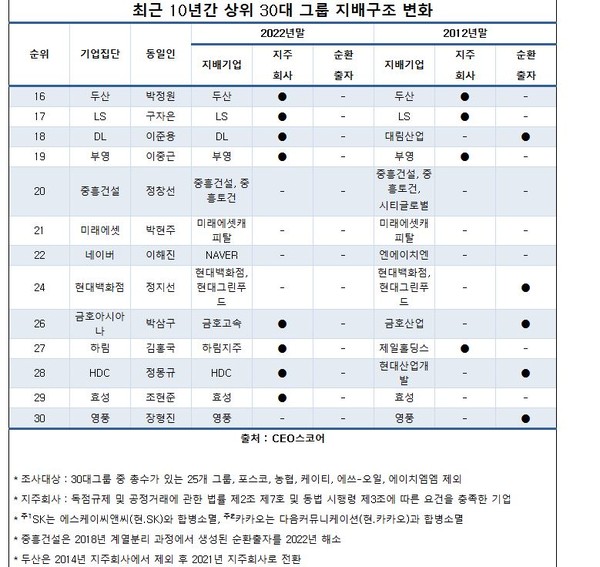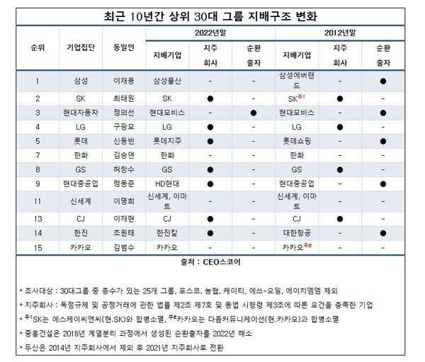 특히 주목할 점은 국내 주요 그룹 대부분이 지배구조 개편을 통해 고질병인 순환출자 구조에서 벗어난 점이다. 최근 10년간 삼성, 현대자동차, 롯데, 현대중공업, 한진, DL, 중흥건설, 현대백화점, 금호아시아나, HDC, 영풍 등 11개 기업이 만성적인 순환출자 상태에 있었지만, 2022년 말에는 현대자동차그룹을 제외한 나머지 그룹 모두 이를 해소했다.