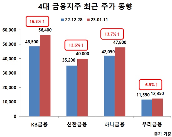 11일 종가 기준 KB금융은 지난해 12월 28일 종가 대비 주가가 16.3% 상승했고 신한금융과 하나금융 역시 같은 기간 각각 주가가 13.6%와 13.7% 상승했다. 우리금융의 주가 상승률은 6.9%를 기록하며 경쟁사 대비 절반에 그쳤다.