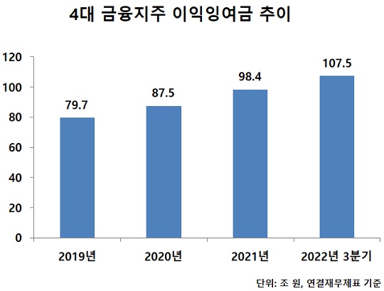 지난해 3분기 말 연결 재무제표 기준 4대 금융지주의 이익 잉여금은 약 107조5000억 원으로 전년 말 대비 9조1000억 원 증가했다. 4대 금융지주 이익 잉여금이 100조 원을 돌파한 것은 지난해가 처음이다.
