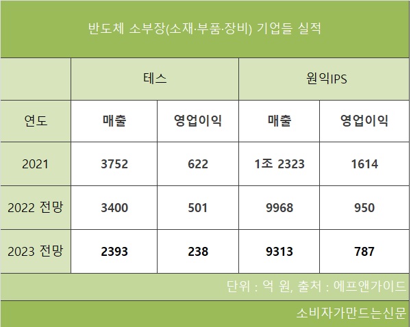 16일 금융정보업체 에프앤가이드에 따르면 반도체 장비 기업 테스(대표 주숭일), 원익IPS(대표 이현덕) 등 소부장 기업들의 지난해 예상 연간 실적은 모두 암울하다.