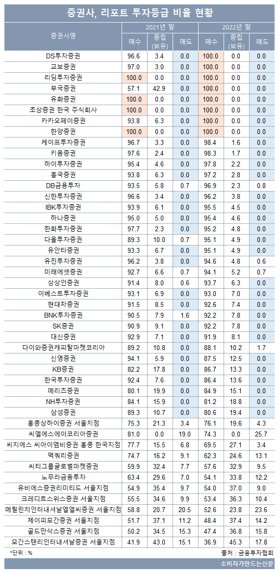 2021년에 비해 코스피 지수가 20% 넘게 떨어졌지만 전체 증권사 가운데 65% 이상이 지난 1년 동안 ‘매도’ 리포트를 단 한 건도 내지 않았다. DS투자증권, 교보증권, 리딩투자증권, 카카오페이증권 등 일부 증권사는 100% ‘매수’ 리포트만 제시해 신뢰도가 떨어진다는 지적도 나오고 있다.