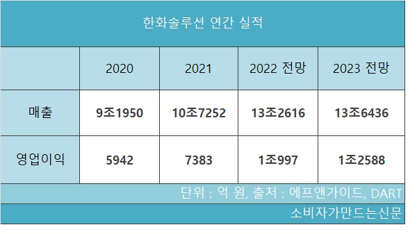 금융정보업체 에프앤가이드에 따르면 지난해 한화솔루션의 연간 영업이익은 1조997억 원으로 전년 동기대비 48% 증가할 것으로 전망된다. 2020년 한화솔루션 출범 이후 처음으로 1조를 넘긴 것이다. 올해 영업이익 전망치도 1조2500억 원을 넘기며 안정적으로 ‘1조 클럽’에 입성할 것으로 보인다.