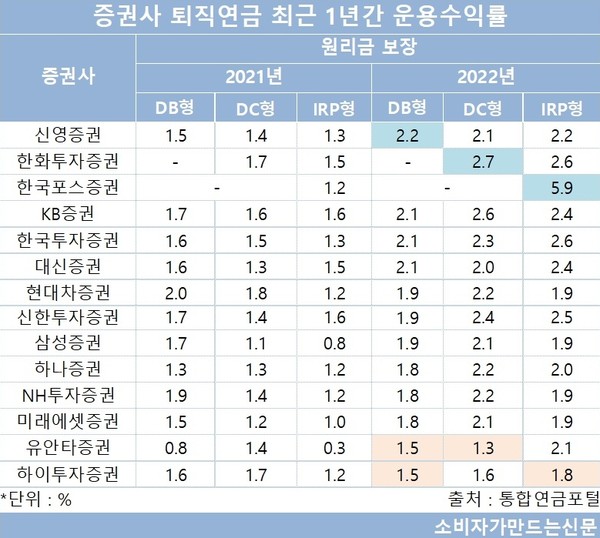 반면 유안타증권은 DB형 운용수익률이 1.5%, DC형이 1.3%를 기록해 가장 저조했다. 하이투자증권도 DB형 1.5%, IRP형 1.8%로 최하위를 기록했다.