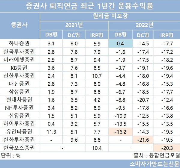 하나증권의 DB형 수익률은 0.4%였으며 이어 한국투자증권이 -1.6%, 미래에셋증권이 -1.9%, KB증권이 -3.7%로 집계됐다. 가장 큰 손실을 기록한 곳은 유안타증권으로 -16.2% 마이너스 수익률을 기록했다.