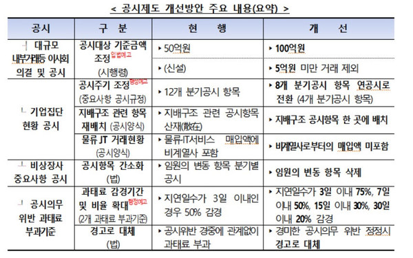 또 기업집단 현황 공시도 주기를 조정한다. 현행 공시대상기업집단 소속 기업은 기업집단의 소유 지배 구조, 내부 거래 현황 등 12개 항목 중 활용도가 낮거나 보완 가능한 항목 등 8개 항목은 연 공시로 통합했다. 기존에는 12개 항목을 분기별, 18개 항목은 연 1회 정기 공시하도록 하고 있었다.
