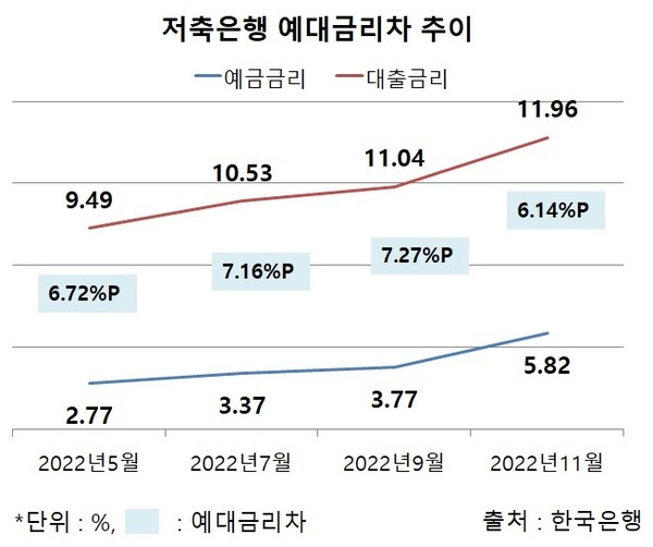 한국은행에 따르면 지난해 11월 저축은행의 정기예금(1년 만기)과 대출 금리 차이는 6.14%포인트로 집계됐다. 지난해 9월 대비 예대금리차는 1.13%포인트 좁혀졌다. 예대금리차는 보통 7%대로 유지되는데 고금리 기조의 장기화로 수익성이 악화되면서 6%포인트대 초반까지 줄어든 것이다.