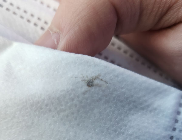 경남 사천시에 사는 이 모(여)씨는 갓 개봉한 덴탈 마스크를 착용하기 전 안쪽 면에 시커먼 이물을 발견했다. 자세히 살펴보니 벌레가 납작하게 눌린 상태였다.
