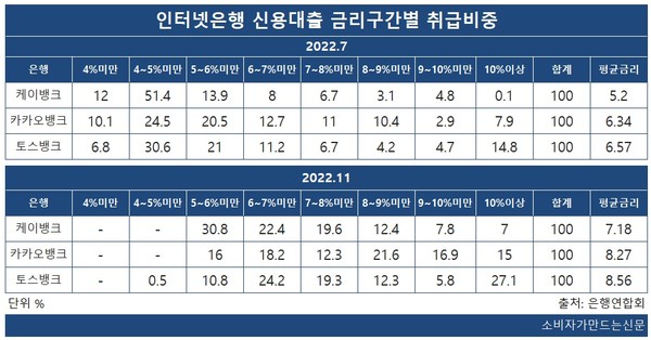 하지만 고금리를 부담하는 차주가 크게 늘어났다. 11월 기준 금리 10%이상 차주는 토스뱅크 27%, 카카오뱅크 15%, 케이뱅크 7%로 집계됐고 9~10%미만 금리를 부담하는 차주는 카카오뱅크 17%, 케이뱅크 7%, 토스뱅크 5%로 집계됐다.