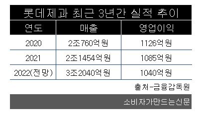 롯데제과는 최근 3년간 매출은 오르고 있지만 역시 영업이익은 하락세다. 매출의 3분의2 이상을 차지하는 국내에서 수익이 점점 줄고 있다.