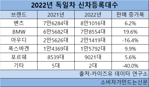 19일 카이즈유 데이터 연구소에 따르면, 2022년 독일차 신차등록대수는 20만5804대로, 전체 수입차 신차등록대수(29만34대)의 71%를 차지했다. 전년도(66.4%)보다 4.6%포인트 높아졌다.