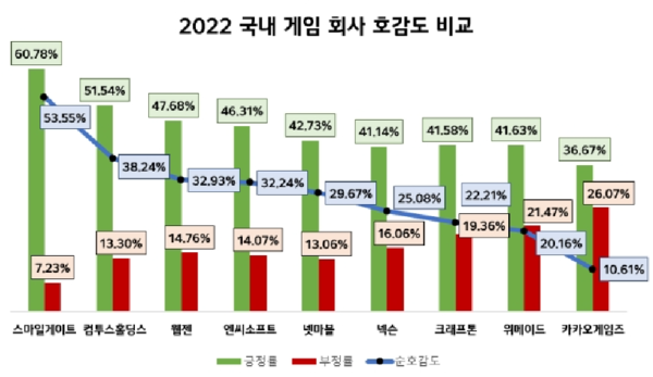 데이터앤리서치는 작년 한 해 동안 뉴스·커뮤니티·카페·유튜브·블로그·트위터·인스타그램·페이스북·카카오스토리·지식인·기업/조직·정부/공공 등 23만개 사이트에서 9개 국내 게임사 키워드 포스팅들에 대해 긍정과 부정으로 구분되는 감성도 조사를 실시했다.