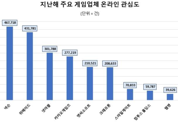 이어 카카오게임즈, 엔씨소프트, 크래프톤, 스마일게이트, 컴투스홀딩스, 웹젠 순으로 네티즌들의 관심을 받은 것으로 나타났다.