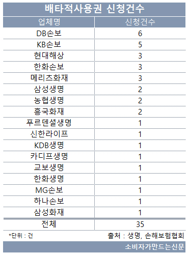 지난해 배타적사용권을 가장 많이 신청한 곳은 DB손해보험으로 6건에 달했다. 3월 ‘DB플러스보장건강보험’의 새로운 위험담보에 대해 배타적사용권을 신청해 3개월 동안 독점권을 획드했으며 6월 ‘참좋은 시니어 헬스케어보장보험’, 8월 ‘나에게 맞춘 간편건강보험2207’은 6개월을 받았다.