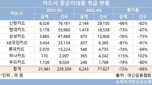 각 사별로 지난해 4분기 하나카드를 제외한 6곳 모두 중금리대출 취급액이 전분기 대비 60% 이상 급감했다.