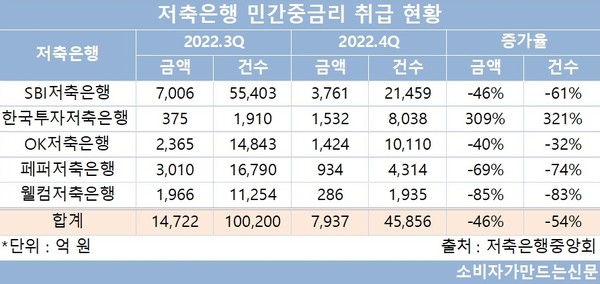 저축은행의 민간중금리대출 취급도 크게 줄었다. 저축은행중앙회에 따르면 지난해 4분기 기준 민간중금리대출 취급액은 1조5083억 원으로 전분기 3조1516억 원 대비 절반 이상 급감했다.