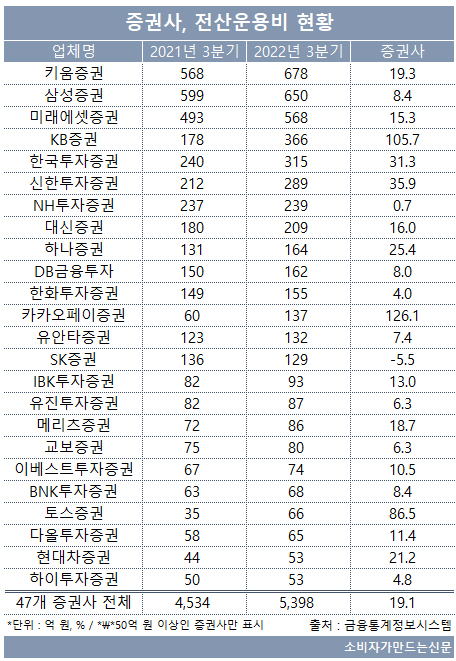 30일 금융통계정보시스템에 따르면 지난해 3분기 기준 47개 증권사의 전산운용비는 5398억 원으로 전년 동기 4534억 원 대비 19.1% 증가했다. 전산운용에 50억 원 이상을 투자하는 증권사 가운데 전산운용비가 줄어든 곳은 SK증권 단 한 곳뿐이었다.