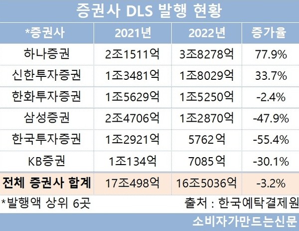 지난해 DLS 발행 규모 상위 증권사 6곳 중 4곳의 발행액이 전년 대비 줄었다. 이 가운데 하나증권이 총 3조8278억 원을 발행해 점유율 23.19%를 기록하며 1위에 올랐다. 이는 전년 대비 77.9%나 급증한 것이다.