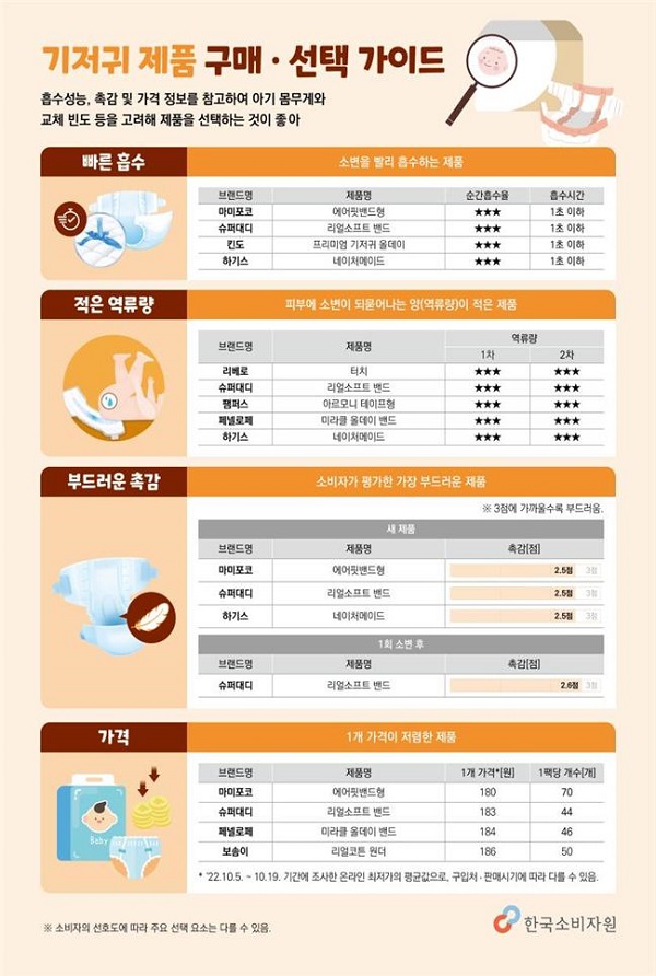 소비자 100명을 대상으로 기저귀 안감의 부드러움을 평가한 결과, 마른 상태에서는 ‘마미포코(에어핏밴드형)’, ‘슈퍼대디(리얼소프트 밴드)’, ‘하기스(네이처메이드)’ 제품이, 1회 소변(30mL)을 흡수한 후인 젖은 상태에서는 ‘슈퍼대디(리얼소프트 밴드)’ 제품이 시험 대상 10개 제품 중 가장 부드러운 것으로 나타났다.