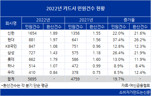 신한카드는 민원건수가 2021년 1356건이던 것이 지난해 1654건으로 22.0% 늘어났다.