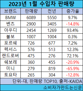 이외에 아우디가 전년 동기 대비 판매량이 93.4%나 늘었고 랜드로버도 72.1% 증가했다. 반면 미니는 65.9% 감소했으며 전 차종 출고 중단 사태를 겪은 폭스바겐은 판매량이 83.8%나 줄며 10위권 밖으로 밀려났다.