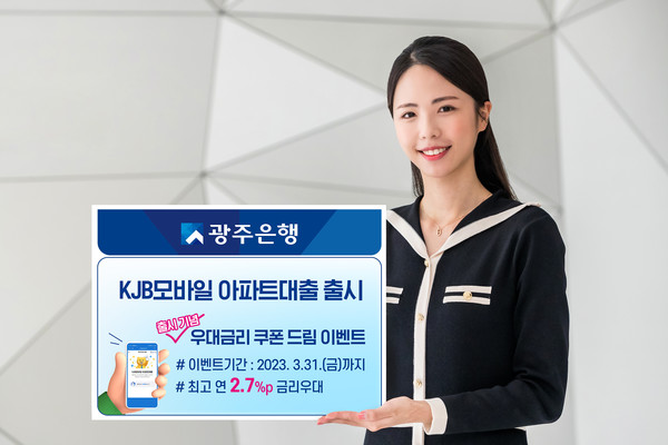 광주은행은 ‘KJB모바일 아파트대출’ 출시를 기념해 오는 3월31일까지 총 100억 원 한도까지 연 2%포인트 우대금리를 제공하는 ‘우대금리 쿠폰 드림’ 이벤트를 실시한다. 예상한도를 조회하고 쿠폰받기를 선택하면 우대금리가 자동 적용된다.