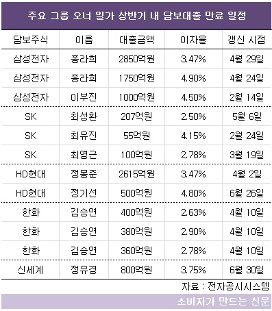 소비자가 만드는 신문이 올 상반기 내에 만료되는 30대 그룹 오너 일가 주식담보대출 계약 건을 조사한 결과 다수의 오너 일가들이 계약 갱신에 따라 이자부담이 커질 것으로 관측된다.
