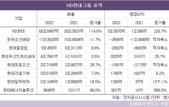 한국조선해양과 현대미포조선(대표 김형관), 현대일렉트릭(대표 조석) 등 그룹 대표 계열사들도 두 자릿수 비율로 매출이 증가했다.