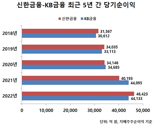 한편 두 금융지주의 배당정책은 대동소이했다. KB금융은 2022 회계연도 현금 배당성향 26%와 자사주 매입 및 소각(약 3000억 원)을 반영한 총주주환원율은 전년 대비 7%포인트 상승한 33%를 기록했다.