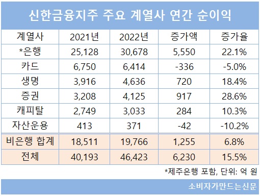 핵심 비은행 계열사인 신한카드 당기순이익이 전년 대비 5% 감소했지만 신한라이프생명(18.4%)과 신한투자증권(28.6%), 신한캐피탈(10.3%) 등 다른 계열사 순이익 증가율이 전년 대비 큰 폭으로 증가하면서 전체 비은행 실적 개선을 이끌었다. 신한투자증권의 경우 업권 불황에도 지난해 사옥매각이익이 반영되면서 전체 연간 순이익은 증가했다.