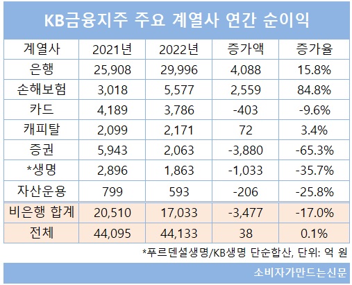 KB금융지주 비은행 순이익은 전년 대비 17% 감소한 1조7033억 원에 머물렀다. KB손해보험이 손해율 하락과 부동산 매각 이익이 반영되면서 순이익이 전년 대비 84.8% 증가한 5577억 원으로 호실적을 달성했지만 KB증권(-65.3%)이 전년 대비 순이익이 절반 이상 급감했다.