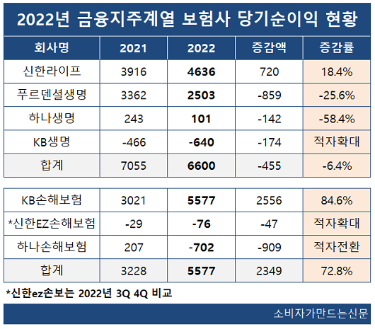 9일 업계에 따르면 신한금융, KB금융, 하나금융그룹 등 주요 금융지주 계열 생명보험사의 지난해 누적 당기순이익은 6600억 원으로 집계됐다. 전년 대비 455억 원(6.4%) 감소했다. 손해보험사는 5577억 원으로 전년 대비 2388억 원(74.9%) 늘었다.