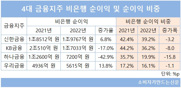 반면 KB금융지주와 하나금융지주는 증권사와 생명보험사 실적이 부진하면서 비은행 순이익 규모도 큰 폭으로 감소했다.