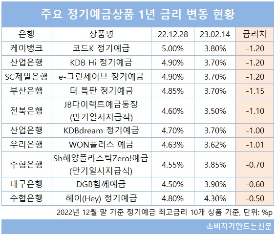 지난해 12월 28일 기준 은행 정기예금 금리 상위 10개 상품 중에서 현재 1%포인트 이상 금리가 하락한 상품은 무려 7개에 달했다.