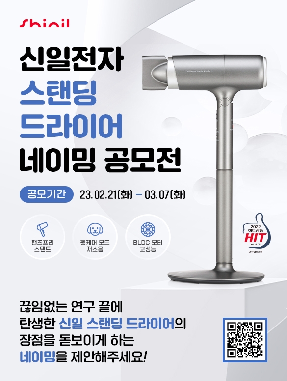 임원택 신일 마케팅사업부 부장은 “젊은 세대를 중심으로 좋은 반응을 얻고 있는 제품인 만큼 고객 취향을 반영한 신선한 아이디어가 접수되길 기대하고 있다”며 “수상작으로 채택된 네이밍은 ‘스탠딩 드라이어’의 새로운 이름으로 적극 반영할 계획이니 많은 분들의 관심과 참여 부탁드린다”고 전했다.