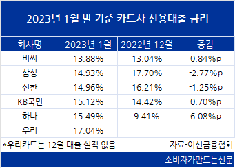 반면 같은 기간 하나카드와 BC카드는 각각 6.08%포인트, 0.84%포인트가 오른 15.49%와 13.88%였다. KB국민카드도 0.7%포인트가 올라 15.12%였다. 우리카드는 12월 말 기준으로 취급한 신용대출이 없었고 1월에는 17.04%였다.