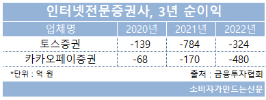 반면 카카오페이증권은 당기순손실이 전년 170억 원에서 지난해 480억 원으로 적자폭이 확대됐다.
