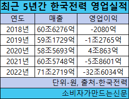 한국전력이 발표한 지난해 실적은 매출 71조2719억 원, 엉업손실 32조6034억 원으로 공시됐다. 2021년에도 영업적자 규모가 5조8601억 원에 달했는데 지난해 영업손실이 5배 이상 커졌다.
