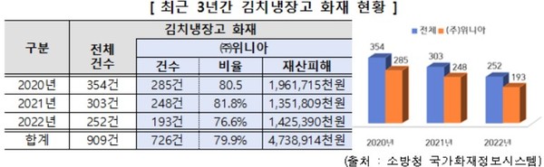 최근 3년간 발생한 김치냉장고 화재 총 909건을 분석한 결과, 79.9% (726건)가 위니아 김치냉장고였고, 이 중 제조 연월이 확인되는 567건의 94.0%(533건)가 2005년 9월 이전 생산된 제품으로 나타났다.