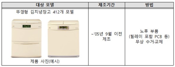23일 국가기술표준원에 따르면 리콜 대상 제품은 위니아가 2005년 9월 이전에 생산한 뚜껑형 구조의 김치냉장고다. 일부 부품 노후화에 따른 합선으로 화재 발생 우려가 있어 제조사가 2020년 12월 2일부터 자발적 리콜을 실시하고 있다.
