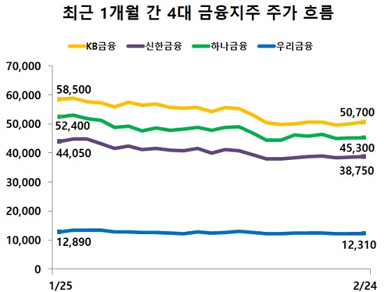 금융 대장주인 KB금융의 24일 종가 기준 주가는 5만700원으로 한 달 전보다 13.3% 하락했다. KB금융 주가는 지난 달 중순 한 때 6만 원을 돌파하며 52주 신고가를 경신했지만 이 달 들어 큰 폭으로 하락하면서 간신히 5만 원 선을 지켰다.