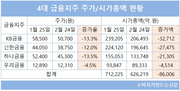 주가가 큰 폭으로 하락하면서 각 금융지주사 시가총액도 속절없이 감소했다. 지난 달 25일 종가 기준 4대 금융지주 시가총액은 71조2225억 원에 달했지만 한 달이 지난 24일 종가 기준 시총은 62조6219억 원으로 한 달새 8조6006억 원이 증발했다.
