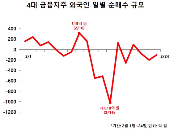 금융당국발 압박이 이어지면서 외국인과 기관투자자들을 중심으로 이탈도 가속화되고 있다. 2월 한 달간 4대 금융지주 외국인 순매도 금액은 1569억 원으로, 윤 대통령의 '은행은 공공재' 발언이 있던 이 달 중순에 매도세가 집중되고 있는 모습이다.