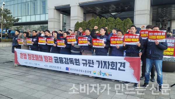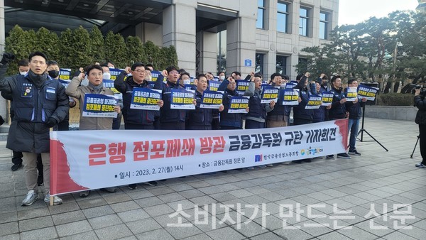 27일 금융노조는 금융감독원 정문 앞에서 '은행 점포폐쇄 방관 금융감독원 규탄 기자회견'을 열었다.
