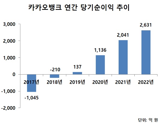 수익성에서도 카카오뱅크는 지난해 당기순이익이 전년 대비 28.9% 증가한 2631억 원을 기록하며 연간 기준 최대 순이익을 달성했다. 비은행 업황 부진으로 플랫폼 및 수수료 수익 비중이 하락했지만 이자수익이 증가하면서 전체 실적은 향상됐다.