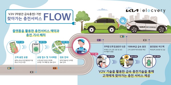 현재 기아가 개발 중인 V2V 급속 충전 기술은 전기차 내부에 별도 제어기를 탑재해 전기차 충전구끼리 케이블로 연결시 차량간 충/방전을 가능하게 하는 기술이다. 상용화 될 경우 전기차 고객은 충전을 위해 이동하거나 대기하는 시간을 줄일 수 있고 에너지 거래를 통한 수익 창출도 가능하다는 설명이다.
