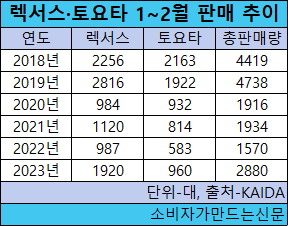 7일 한국수입자동차협회(KAIDA)에 따르면 렉서스의 올해 1~2월 누적 판매량은 1920대로 전년 같은 기간 대비 94.5% 증가했다. 토요타의 누적 판매량 역시 64.7% 늘어난 960대를 기록했다.
