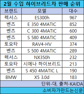 특히 '렉서스 ES300h'가 하이브리드 시장에서 에이스 노릇을 톡톡히 하고 있다. 렉서스 ES300h는 지난 1월 476대가 팔린 데 이어 2월에는 967대가 판매되며 올해 수입 하이브리드차 판매 1위를 지키고 있다. 2월에는 '토요타 RAV4-HV' 374대·'렉서스 NX350h' 232대·'토요타 시에나 하이브리드' 213대 등이 판매되며 수입 하이브리드차 판매 TOP10에 이름을 올렸다.