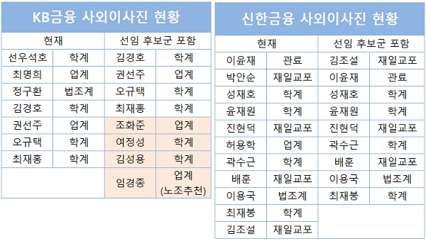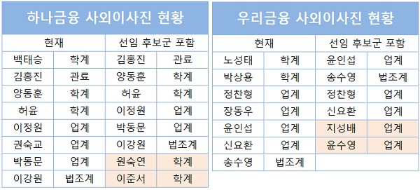 하나금융은 정관상 사외이사 임기(6년)를 채운 백태승 사외이사 그리고 권숙교 사외이사가 퇴임하는 대신 원숙연 이화여대 행정학과 교수와 이준서 동국대 경영학과 교수가 신규 선임될 예정이다. 두 후보가 공식 선임될 경우 하나금융은 사외이사 8명 중에서 교수 출신이 절반을 차지하게 된다.