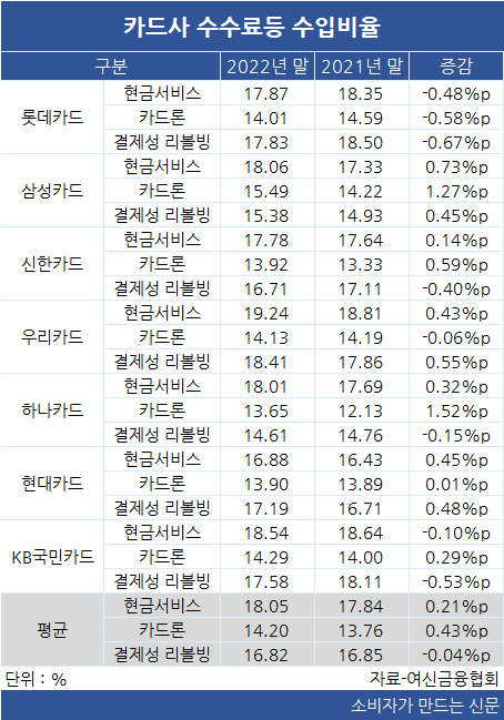 롯데카드는 현금서비스, 카드론, 결제성 리볼빙의 수입비율이 각각 0.48%포인트, 0.58%포인트, 0.67%포인트 떨어졌다.