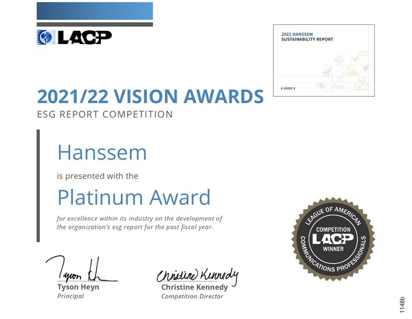 한샘 지속가능경영보고서는 비전 어워드 ESG 레포트 부문에서 최고 등급인 대상을 수상했다. 첫인상·디자인·창의성·정보전달력 등 8개 평가항목 중 7개 항목에서 만점을 받으며 총점 99점을 획득했다. 기존의 정형화된 이미지의 보고서를 탈피해 아이콘을 활용한 커버 디자인을 채택해 접근성을 높인 점을 높게 평가받았다. 그 결과 1000여 개의 지원 기업 중 LACP가 선정한 우수작품 ‘월드 와이드 탑 100(World Wide Top 100)’에도 11위로도 선정됐다.